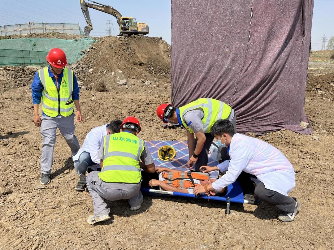 此次演练模拟作业人员在绑扎钢筋时发生意外,现场负责人迅速进行应急救援处置,并对本次事故进行评估。整个演练井然有序,各个小组分工明确,达到了预期效果。