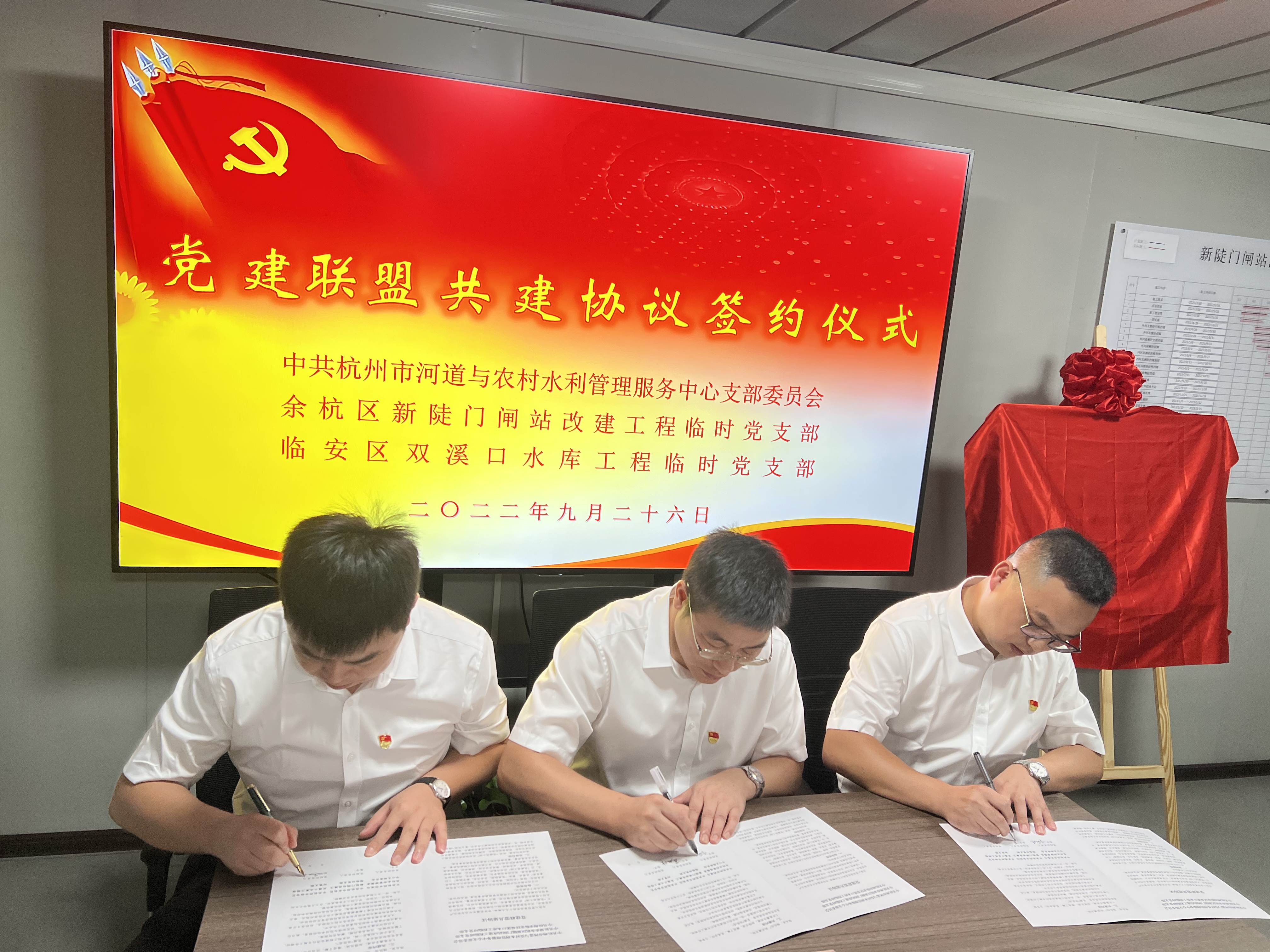 9月26日,中共杭州市河道与农村水利管理服务中心支部委员会、中共杭州市余杭区新陡门闸站改建工程临时党支部、中共杭州市临安区双溪口水库工程临时党支部在新陡门闸站改建工程现场举行党建联建协议签约仪式。市农水中心支部书记、主任叶利伟,余杭区林水局党委委员、二级调研员徐伟林,临安水利局机关党委副书记、纪检书记刘勇,新陡门闸站改建工程临时党支部书记葛旭峰,双溪口水库工程临时党支部书记孟天琦及各支部代表参加签约活动。