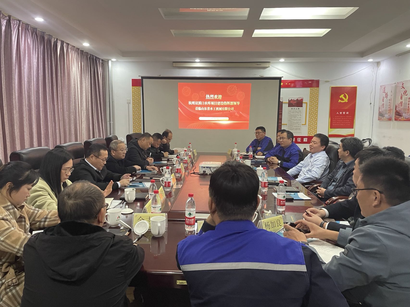 11月13日-14日,杭州市临安区双溪口水库工程建设指挥部副总指挥、水利水电局党委副书记刘保法等一行莅临水工机械公司考察指导工作,山东williamhill中国官方网站党委副书记、董事、总经理靳文硕,党委委员、副总经理付海华,第六分公司、杭州鲁润公司等相关人员陪同考察。