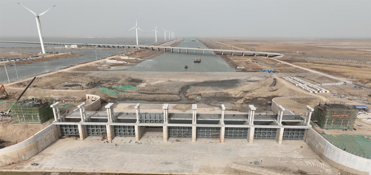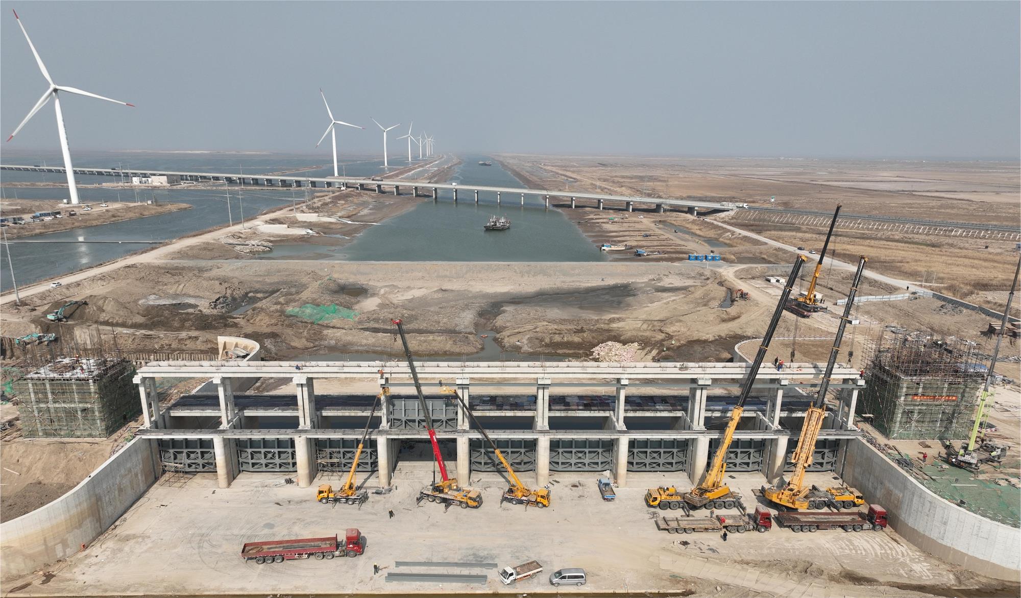 该项目自2023年开工以来,项目部秉着“起跑即冲刺、开局即决战”的理念,克服临海大风恶劣天气、高空作业及工序穿插作业等困难,通过项目部人员集思广益,优化施工方案,严格把控施工质量,牢记安全红线,一个月内完成闸门安装、交通桥板、检修桥板及机架桥板吊装等工作。