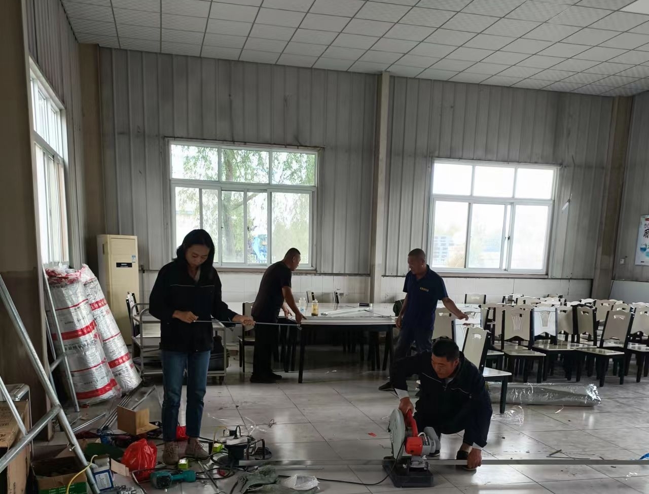在施工现场,劳务公司党员干部带领员工及外聘人员对食堂进行吊顶装饰,安装吊筋、龙骨、面板,穿管线布线等。曲阜基地食堂屋顶原是彩钢瓦单层装配结构,冬不保暖、夏不隔热,有些部位已经腐蚀生锈,甚至弯曲变形。本次餐厅升级用轻钢龙骨和硅钙板加岩棉吊顶,用木质龙骨和pvs板装饰灶房,既达到隔热保温效果,又最大程度节约了成本,解决了夏天酷热、冬天寒冷的就餐问题。