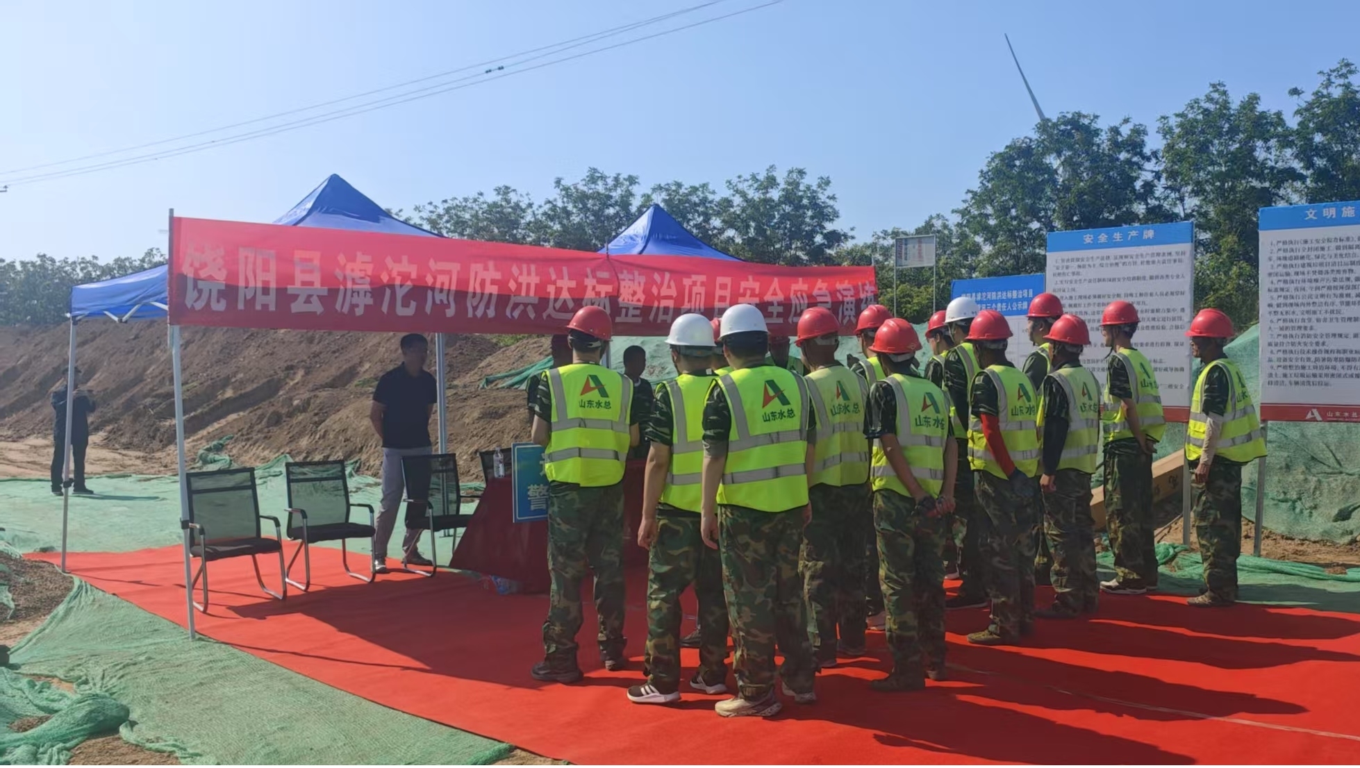 为筑牢防汛安全防线,切实强化全员安全防范意识,全面提升突发事件应急处置能力,近日,第二分公司滹沱河防洪达标整治项目开展2025年度防汛、消防综合应急演练。项目业主单位、施工单位、监理单位协同参与,饶阳县水利局代表到场观看。