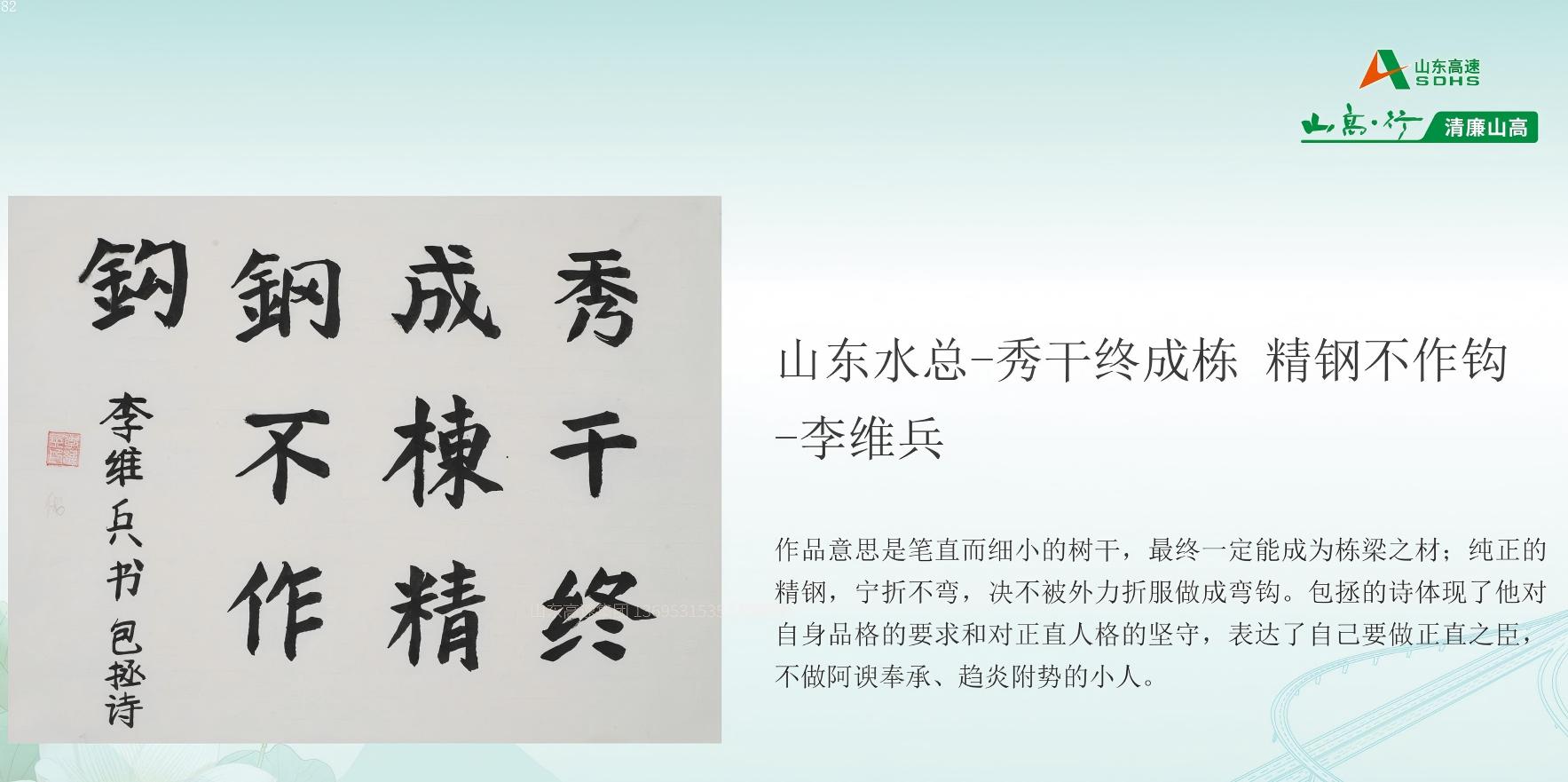 6月11日,在山东高速集团纪委组织的“清廉山高”廉洁文化作品征集活动中,山东williamhill中国官方网站基础工程有限公司制作的短视频《筑廉洁防线,守初心之路》荣获“光影映廉”板块三等奖,第二分公司李维兵的书法作品《秀干终成栋,精钢不作钩》摘得“工艺创廉”书法类优秀奖。